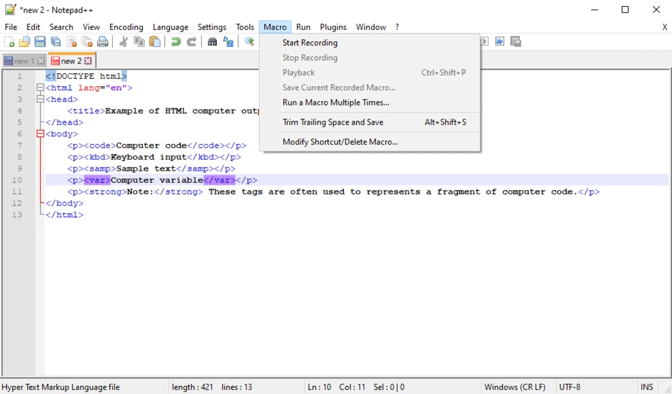 Kod düzenleme sürecini sorunsuz ve hızlı hale getirmek için neredeyse 80'den fazla programlama diline kesintisiz destek sunar. Desteklenen diller arasında C, Java, XML, HTML, PHP, JavaScript, RC kaynak dosyaları, makefile, ASCII art dosyaları, doxygen, ini dosyaları, ASP, VB/VBS dosyaları, SQL, Objective-C, CSS, Pascal, Perl, Python vb. yer alır.